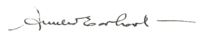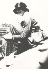 The marketing campaign by both Earhart and Putnam was successful in establishing the Earhart mystique in the public psyche.[75] Rather than simply endorsing the products, Earhart actively became involved in the promotions, especially in women's fashions. For a number of years she had sewn her own clothes, but the "active living" lines that were sold in 50 stores such as Macy's in metropolitan areas were an expression of a new Earhart image.[76] Her concept of simple, natural lines matched with wrinkle-proof, washable materials was the embodiment of a sleek, purposeful, but feminine "A.E." (the familiar name she went by with family and friends).[73][77] The luggage line that she promoted (marketed as Modernaire Earhart Luggage) also bore her unmistakable stamp.