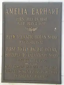 Amelia Mary Earhart (/ˈɛərhɑːrt/ AIR-hart; July 24, 1897; disappeared July 2, 1937; declared dead January 5, 1939) was an American aviation pioneer and writer.[2][Note 1] Earhart was the first female aviator to fly solo across the Atlantic Ocean.[4] She set many other records,[3][Note 2] was one of the first aviators to promote commercial air travel, wrote best-selling books about her flying experiences, and was instrumental in the formation of The Ninety-Nines, an organization for female pilots.[6]
