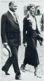 Earhart's ideas on marriage were liberal for the time, as she believed in equal responsibilities for both breadwinners and pointedly kept her own name rather than being referred to as "Mrs. Putnam". When The New York Times, per the rules of its stylebook, insisted on referring to her as Mrs. Putnam, she laughed it off. Putnam also learned that he would be called "Mr. Earhart".[102] There was no honeymoon for the newlyweds, as Earhart was involved in a nine-day cross-country tour promoting autogyros and the tour sponsor, Beech-Nut chewing gum. Although Earhart and Putnam never had children, he had two sons by his previous marriage to Dorothy Binney (1888–1982),[103] a chemical heiress whose father's company, Binney & Smith, invented Crayola crayons:[104] the explorer and writer David Binney Putnam (1913–1992) and George Palmer Putnam, Jr. (1921–2013).[105] Earhart was especially fond of David, who frequently visited his father at their family home, which was on the grounds of The Apawamis Club in Rye, New York. George had contracted polio shortly after his parents' separation and was unable to visit as often.