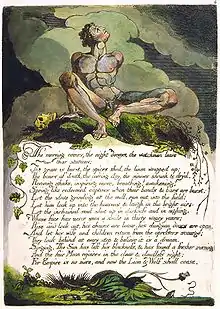 Allan Cunningham believed that the work was "plentifully seasoned with verse".[23] Henry Crabb Robinson believed the work to be obscure.[7] J. T. Smith was confused by the "expressions," which "are mystical in a very high degree," but thought the poem's designs were "very fine".[23] Alexander Gilchrist remarked that "Turning over the leaves it is sometimes like an increase of light on the retina, so fair and open is the effect of particular pages".[24]