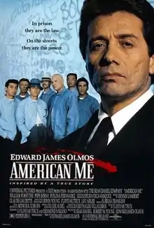 American Me is a 1992 American independent[3] crime drama film produced and directed by Edward James Olmos and written by Floyd Mutrux and Desmond Nakano. The film is the first film Olmos ever directed. Olmos also stars as the film's protagonist, Montoya Santana, who is loosely based on Mexican Mafia boss Rodolfo Cadena.[4] Executive producers included record producer Lou Adler, screenwriter Mutrux, and Irwin Young. The film is a fictionalized account of the founding and rise to power of the Mexican Mafia in the California prison system from the 1950s into the 1980s.