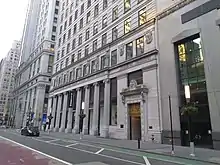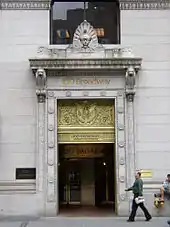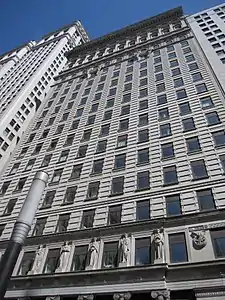 The main entrance is located on Broadway and consists of a two-story Ionic-style colonnade supporting a seven-bay-wide portico; this portico was five bays wide prior to the expansion.[4] The third-story windows above the portico are flanked by six classical figures designed by J. Massey Rhind.[10][16] Two more figures, in the same style as Rhind's originals, were added in the expansion.[13][19][8] At the top of the colonnade is an elaborate frieze. The Broadway facade also has an entrance to the upper floors at its southern end. On Pine Street, the lowest two stories are supported by two-story piers above a granite water table, supporting an entablature that wraps around from Broadway. There is a service entrance on the east end of the Pine Street facade, and the third-story windows on this facade have projecting window surrounds with connecting spandrel panels. An entablature runs above the third story on Pine Street and Broadway.[4]