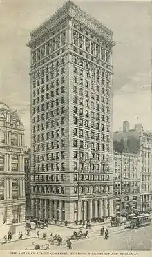 During the late 19th century, life insurance firms were some of the first companies to build high-profile skyscrapers.[33] At the time of the American Surety Building's construction, life insurance companies generally had their own buildings for their offices and branch locations. According to architectural writer Kenneth Gibbs, these buildings allowed each individual company to instill "not only its name but also a favorable impression of its operations" in the general public.[33][34] This had been a trend since 1870,[33][35] with the completion of the former Equitable Life Building just north of the American Surety site.[33][36]