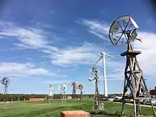 Complementing the water pumping windmills are wind electric machines. Some of these date to the early 1920s. Dominating the windmill grounds is a Vestas V47 wind turbine. This 660 kW turbine stands on a 50-meter tower and provides (on a yearly average) all of the power required by the museum facility. Excess energy is sold to the local power grid.[2]
