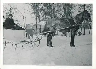 An old gray mare named May was a pioneer partner of the Amherst Telephone Company. She transported poles, materials and linesmen from 1903 though 1929. May was known to the whole community, and many local youth had fun riding her carriage to social gatherings. A car was hired to help her in 1920, but she still was often needed due to the poor roads, which were piled high with snow in the winter.