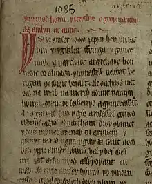 The opening lines of the early 14c Welsh language Amlyn ac Amig manuscript from the Red Book of Hergest (Jesus College, Oxford; MS 111