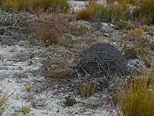 The mound is constructed from white sand and organic matter and is distinctively black in colour due to the cement excreted by the termites. The exterior consists of irregular chambers that are interconnected with other cells through small circular openings. The interior of the mound has larger chambers with thinner walls. There is no royal cell in the mound; instead, breading termites move freely though the network of cells at the centre of the mound. The species is not a fungus grower and as such there are no fungus gardens in the mound. The mounds tend to be as high as they are wide and can reach up to 50 centimeters in height and width.[2]
