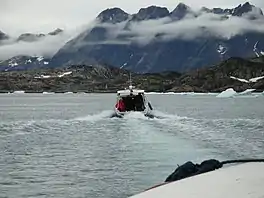There are three settlements in the vicinity of the fjord. The only village on the mainland is Kuummiit, located on the central fjord's eastern coast, perched on the tip of a partially glaciated peninsula.[1] The main settlement of the Ammassalik archipelago is the town of Tasiilaq, located on the island of Ammassalik, near the mouth of the tributary Tasiilaq Fjord (Danish: Kong Oscars Havn), just south of the mouth of Ammassalik Fjord. Further to the southeast, Kulusuk village occupies the northern shore of Kulusuk Island.