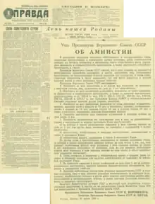 The Amnesty of 1953 was the largest amnesty in the history of the Soviet Union (and in the history of Russia) in terms of the number of the released persons. It was declared by the March 27, 1953 Decree of the Supreme Soviet of the Soviet Union "About the Amnesty".[1][2] Since it was signed by Kliment Voroshilov, it was initially known as the Voroshilov's amnesty.[1] Later it has become known as Beria's amnesty, because it was initiated by March 26, 1953 Lavrenty Beria's draft.[3] Between 1.2 million [4] and 1.35 million[5] persons were freed.