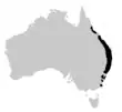 Fleay's barred frog (Mixophyes fleayi) is restricted to a fragmented range of less than 500 km2; this species is classified as endangered.