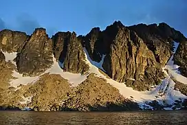 ![]() Amphitheater Mountain from Upper Cathedral Lake at sunset. | |