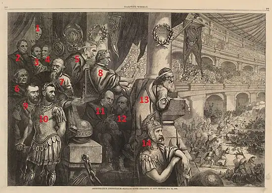 - ↑ "Amphitheatrum Johnsonianum – Massacre of the Innocents at New Orleans – July 30, 1866". Harper's Weekly. Vol. XI, no. 535. March 20, 1867. pp. 200–201 – via Internet Archive.