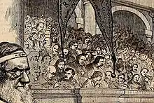The victims are black, and their sacrifice, as gladiators, makes a "Roman holiday"[lower-alpha 4] now red. Beneath the picture is written, "Amphitheatrum Johnsonianum—Massacre of the Innocents at New Orleans, July 30, 1866." This inscription tells the terrible story...But this is only a single scene in one place. Wherever in the Rebel States there is a truly loyal citizen, loving the Union, there is a victim who may be called to suffer at any moment from the distempered spirit which now rules. I speak according to the evidence. This whole country is an "Amphitheatrum Johnsonianum," where the victims are counted by the thousand. To my mind, there is no duty more urgent than to guard against this despot, and be ready to throw the shield of Congress over loyal citizens whom he delivers to sacrifice.