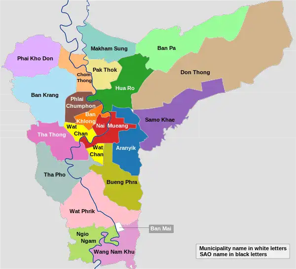 Phitsanulok is a city municipality (thesaban nakhon) which covers tambon Nai Mueang. Aranyik is a town municipality (thesaban mueang). Hua Ro, Tha Thong, Ban Khlong, Phlai Chumphon and Ban Mai are subdistrict municipalities (thesaban tambon). Ban Mai has not covered parts of tambons Wang Nam Khu and Wat Phrik since 1999. There are further 14 Subdistrict Administrative Organisations - SAO (ongkan borihan suan tambon).[2]