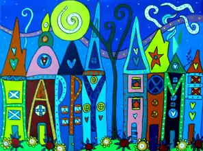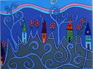 In 2001 Steinberg began turning her 'doodles' into multi-media pieces of fine art. Her work is mostly bright acrylic pieces with words inside the images (pictures below).