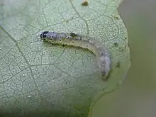 Larvae can be found from mid-April to June. The head and divided prothoracic plate are black and the body is greyish green with round black pinacula which are easily seen, while the anal plate is brownish. The larva rolls a leaf into a tube, held together with silken strands which can be seen on the edges of the roll. On creeping willow, due to their small size several leaves are spun around the central shoot, starting a short distance below the tip and working upwards.[3][4] Larvae of A. temerella also roll leaves around creeping willow.[5]