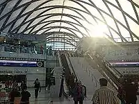 The tubular steel-framed 67,880-square-foot building (6,306 m2)[41] has a compound curved shell that is covered with a 200,000-square-foot (19,000 m2) ethylene tetrafluoroethylene (ETFE) roof system. This allows diffuse sunlight to illuminate a major portion of the building's interior. At night, the structure can be illuminated in any color with the 1,354 energy-efficient lights glowing through the air-filled plastic pillows which make up the arched roof. The structure's entrance is a 120-foot-tall glass wall (37 m) and leads into a spacious lobby ticketing counters.[3] A plaza leads to the thirteen bus bays. The second floor has space for offices and two restaurants. The third level is a mezzanine with a small lobby and the concourse bridge for access to the stairs or elevators that take travelers down to the railroad tracks.[3]