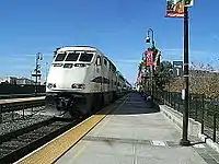 A branch of the Southern Pacific Railway was extended to Anaheim in 1875. In 1887, a rail line to San Diego was built through the Town by Santa Fe Railway. By 1921, there were two Southern Pacific depots and one Santa Fe depot. The Pacific Electric Railway was also planning on a line to connect with the community.[25] Eventually these rail services were discontinued but rail service began again when the city of Anaheim provided a station in 1984 for the Amtrak San Diegan on property on the connections side of the State Route 57 freeway belonging to the Atchison, Topeka & Santa Fe Railroad. In October 1986 a new standard design station was constructed about 600 feet (180 m) northwest to a site where Anaheim Stadium was just across the parking lot,[26] appropriately referred to as Anaheim–Stadium.[27] The station was built to a model 75C Amtrak Standard Stations Program design, measuring 81 by 45 feet (25 by 14 m), and designed to accommodate 75 people at a time, with seating for 48.[28] When it was being planned, it was anticipated that it could become among the top-twenty trafficked Amtrak stations in the nation in terms of ridership.[29] The San Diegan moniker was retired on June 1, 2000, when the service became known as the Pacific Surfliner.