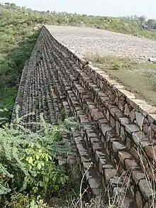 The ancient and solid gravity dam structure, a pre-Islamic structure that fords a local nala (stream) is 7 metres (23 ft) in height and 50 m (160 ft) in length between the two banks. It has been built with quartzite stones (locally available), duly chiselled and dressed, as a regular dam section with downstream base width increasing in steps with depth up to the foundation. It has entry manholes from the top of the dam, which lead into the body of the dam for inspection and control of flow through sluices for downstream uses. The intake entry into the sluice is on the upstream side. The downstream outlet end leads to the flat terrain below the dam at the ground level. The reservoir created by the dam is mostly silted over the centuries, but it is said to be in use.[5][6]