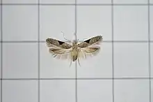The wingspan is about 12 mm. The forewings are greyish ochreous sprinkled with whitish, with some scattered fuscous and blackish scales and with several slight blackish marks on the costa. There is a triangular blackish blotch occupying the median fourth of the costa and reaching more than halfway across the wing. There are also obscure small spots of dark fuscous suffusion in the disc towards the base, near the dorsum at one-fourth, on the dorsum at three-fourths and at the tornus. The hindwings are grey, becoming hyaline (glass like) anteriorly.[3]