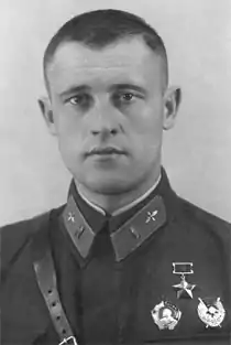 Almost immediately after deploying to the warfront in June 1941 to combat the German invasion of the Soviet Union he gained his first aerial victory, shooting down a PZL.23 while piloting a MiG-3. He continued to tally more aerial victories, including the aerial ramming of a Bf 109 on 7 July 1941 before switching to the Yak-7 shortly thereafter. Having been awarded the title Hero of the Soviet Union on 27 March 1942 for his victories at the start of the war, he was able to quickly rise up through the ranks of the air force, becoming commander of his regiment in July 1942 . Later he was briefly posted to the 287th Fighter Aviation Division from February 1943 until being made commander of the 9th Guards Fighter Aviation Regiment, a "regiment of aces" in August 1943. Despite his high post he continued to fly in combat, tallying several additional shootdowns in 1944 before he died in a fishing accident during a rest break on 18 June 1944. His official tally stands at 11 solo and three shared shootdowns over the course of an estimated 329 sorties.[1][2][3]