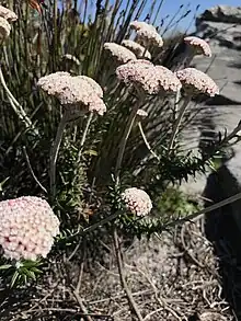 Flowers are most common between August and October.[3] Flowers have, however, been collected throughout most of the year and have been collected between April and December.[2] They are borne in corymbs (flowerheads in which all florets are at the same height despite growing from starting points with different heights).[2][4] The stalks holding the flowers are usually 5–15 mm (0.20–0.59 in) long and densely woolly. The corymb itself is most commonly 15–30 mm (0.59–1.18 in) wide, although measurements of 10–60 mm (0.39–2.36 in) have been recorded.[2]