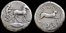 In 484 or 480 BC, Anaxilas won the mule biga event at the Olympic games, and struck this tetradrachm to commemorate his success.[5]