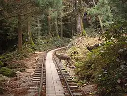 Anbō Forest Railway (安房森林軌道), also known as Yakushima Forest Railway, is one of the last forest railways still operating in Japan. It has a length of 11.2 km, plus a branch of 7.1 km. The railway has a gauge of 762 mm (2 ft 6 in) and starts north of Anbō town, reaching the Arakawa Waterfalls, the ghost village of Kosugidani, and a forest area below Mount Miyanoura and close to the Jōmon Sugi tree. Some sections of the railway tracks are used as hiking trails. However, a section of the route is not open to the public. Since 2013, attempts have been made to use a section of the route as a tourist railway.[3]