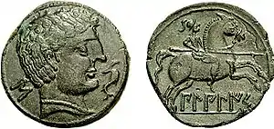 To fund their war effort, the Carthaginians minted gold, electrum, silver and bronze coins.[23] These coins may have been minted in the Barcid 'capital' of Carthago Nova or perhaps were minted simply in Carthaginian military camps. In addition to these coins and those of Gadir and Ebusus, Phoenician colonies along the south coast such as Malaka and Sexi also minted bronze coins.[24]