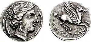 | O: Head Arethusa right, Sicilian style, with three dolphins. | R: Pegasus right, legend in Greek: 'ΕΜΠΟΡΙΤΩΝ' (Emporion). |