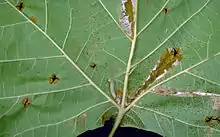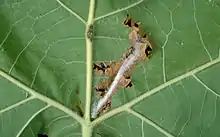 The larvae feed on Platanus species, including Platanus occidentalis. They live on the underside of the leaves, folding them slightly and spinning a web shelter under which they feed and pupate.[3]