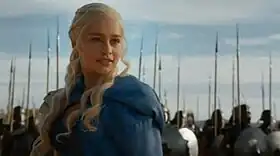 ![]() Daenerys Targaryen tricks Kraznys and orders her new army, the Unsullied, to slay the masters and orders Drogon to scorch Kraznys. Many praised the scene, and highlighted Emilia Clarke's acting. | |