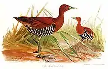 This is the largest Rallina, measuring about 34 cm in length.[4] It has a glossy chestnut plumage, extensive bold barring on underparts, unbarred undertail-coverts, relatively bright apple-green bill and relatively long and fluffy tail; legs and feet are olive-green. It also has pale barring on wings confined to outer primaries and greater and medium coverts.[4][5] Juveniles are duller and less prominently barred.[6] Other similar looking crakes include other Rallina and ruddy-breasted crake Porzana fusca. They are smaller and do not have green bill and legs.[6] Immature birds are duller overall with the barred areas being dark grey-brown with a chestnut tinge, narrowly banded and streaked dirty white. Juvenile birds are paler than adult.[4] Voice is a deep croak. It utters a sharp click as an alarm call.[4]