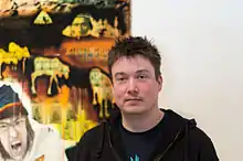 ![]() Anders Sunna at the opening of an exhibition at the Västerbottens Museum in 2016. Partially visible behind him is his painting "Indigenous Love". | |