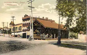 The original alignment of the Anderson Street station dates back to the chartering of the Hackensack and New York Railroad in 1856 by David P. Patterson and other investors. Their intent in creating the rail line was to help maintain a steam-powered train line in the Pascack Valley and have future ambitions to build the system northward. Construction on the new 21-mile (34 km) long line began in 1866, with trains heading from New York City to the Passaic Street station in Hackensack.[6] Although Hackensack was not a large hub, there were several rail lines serving the city, including the New Jersey Midland Line (now the New York, Susquehanna and Western Railroad) with stops at Main Street (at the Mercer Street intersection) and at Prospect Avenue.[7] During the 1860s, service was extended to north, terminating at Essex Street. Residents from the Anderson Street area donated $2,600 (1869 USD) to have a new station depot constructed along new tracks heading northward.[8] Although most Hackensack and New York trains ended at Passaic Street, service was extended northward on September 5, 1869, when that stop was abandoned in replacement for Anderson Street.[9] Just next year, service was extended northward on the Hackensack and New York Railroad Extension Railroad to Cherry Hill (now North Hackensack / New Bridge Landing) and onto Hillsdale.[10]