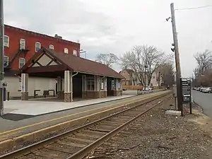 In 1976, the Erie Lackawanna was combined with several other railroads to create the Consolidated Rail Corporation, who continued maintenance of the New Jersey and New York Line for the next seven years, until the newly formed New Jersey Transit took over the station in 1983.[11] On March 17, 1984, the station building, now 114 years old, was added to the New Jersey Register of Historic Places and by that June, the station was added to the National Register of Historic Places.[12] The station building was restored in 2001 by contractors from Jablonski Building Conservation Incorporated in Midtown Manhattan, who had experience restoring train stations.[13] The building conservation repainted the old station's wooden siding yellow[14] and the bay windows to a brand new brown on the station's ground-level platform.[15]