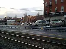 The Anderson Street Station had a wood siding with a shingled roof, two brick chimneys off the roof and two asphalt platforms in both directions. The station also had a garage door on the southern side of the building. No official style of architecture was mentioned for Anderson Street in the 1920 Final Engineering Report due to lack of design.[1] Nearby, a wooden watchman's shanty was constructed near the team track. The station had two tracks run through it (one main track and a team track) and had a rail crossing between tracks.[1] By 1870, the tracks had been extended northward to Hillsdale, and public service began on the line on March 4 of that year. Trains terminated at Hillsdale with fare of only $0.75 (1870 USD), but just one year later, the extension northward. The service was extended northward to the community of Haverstraw, New York, and in 1896, the rail line was leased by the private company to the Erie Railroad.[6]