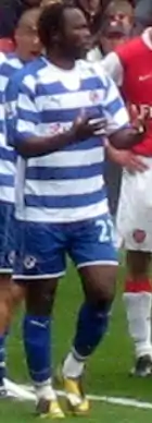 Bikey scored his first league goal for Reading in a 2–1 home defeat to Chelsea on 15 August 2007, which he celebrated with a triple somersault.[21] He scored two more goals in a 2–1 home win over Birmingham City on 22 March.[22] He ended the 2007–08 season with 24 appearances to his name, but was unable to prevent the "Royals" from being relegated. Speaking in September 2008, Coppell bemoaned the fact that Bikey's international commitments had left him only able to train with the club on six days within a three-month period.[23] He scored three goals in 25 Championship games during the 2008–09 campaign as Reading qualified for the play-offs. However, he was sent off for stamping on Robbie Blake during the play-off semi-final first leg at Burnley on 9 May, having earlier conceded the winning penalty taken by Graham Alexander.[24] He aggravated the situation by ripping off his shirt and stamping around the pitch, resulting in the extension of his ban to five games and a charge for improper conduct.[25]
