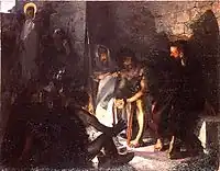 From an early age André wanted to become an artist. His father arranged private lessons with Gabriel Gouray, a former student of Jean-Léon Gérôme, who encouraged the young Devambez to become a history painter. In 1884 took private lessons from Jules Lefebvre at the Académie Julian.[4] In 1885 he succeeded in the entry examination to the École des Beaux-arts, where he studied with Jean-Joseph Benjamin-Constant and Gustave Boulanger. In 1890, He was awarded the Prix de Rome for his somber depiction of the denial of Peter which gave him a position to study and paint for five years at the Villa Médicis of Academy in Rome.