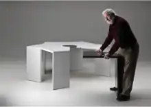Verroken grew up in the Flemish Ardennes in Flanders (Belgium) where he, like his father, was trained as a furniture maker. After marrying Françoise Willecomme and moving to Brussels where he follows an education at Sint-Lucas School of Architecture and becomes an interior architect and furniture designer. In Brussels he became the father of 3 children : Hendrik (1964), Jan (1965) and Inge (1970). In 1967-1968 he teaches Interior Architecture at the Imelda Institute in Brussels. In 1968 he expanded his career as an interior architect from his home and office in Schaerbeek. In 1969 he designs seating furniture for Spectrum in the Netherlands and meets the Dutch designer Martin Visser whom he will call his first great teacher. In the same year he also befriended the constructivist painter Marcel-Henri Verdren. In 1983 he moves to Ghent, with his new partner and manager of a fabric store Arlette Gesquiere, and starts making visual work as a derivative of his furniture designs. In 1983/1984 he became one of the founders and managing director of the Association of Flemish Designers (VVVO). In 1985 he befriends the Basque sculptor Eduardo Chillida to whom he will dedicate a table and furniture design, which in turn will result (in 2007) in a partly posthumous double exhibition Chillida-Verroken. Eventually he moves to Maarkedal where he converts a small warehouse into a design studio and further focuses on designing furniture and visual work. In 2002 he received the Henry van de Velde Prize for Career from the then Flemish Institute for Independent Entrepreneurship (VIZO).[1] In 2016, the municipal council of Maarkedal created a "Special Prize André Verroken" in the context of Z +, a competition for designers, awarded once in 2017.[2]