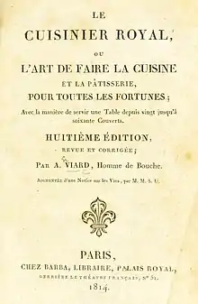 Viard, who called himself "Homme de Bouche",[5] was the chef de cuisine to Louis Philippe, comte de Ségur and Francis Egerton, 8th Earl of Bridgewater.[6] The cookbook appeared under various titles that reflected regime changes: with the restoration of the Bourbons it became Le Cuisinier Royal (Paris: Barba, 1817) in its ninth edition,[4] and in 1852, in its twenty-second edition, Le Cuisinier National. The co-author Fouret appeared in editions of the 1820s. Its last edition appeared in 1875.