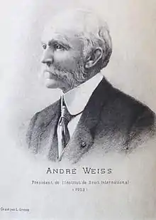 André Weiss was born in Mulhouse in 1858 and completed a degree in law at the University of Paris in 1880. The following year he became a professor at the University of Dijon. In 1891 he moved to the Law School of the University of Paris. There he was from 1896 to 1908 a full professor of civil law, and from 1908 he held the chair for international law and private international law. From 1907 he also acted as legal advisor to the French Ministry of Foreign Affairs. He was a close associate of Secretary of State Aristide Briand and participated as a delegate to the Paris Peace Conference at the end of World War I. He led one of the subcommissions of the conference.