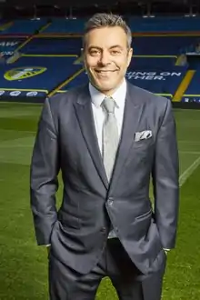 On 23 May 2017, Radrizzani announced the 100% buyout of Leeds United, buying the remaining 50% shares from previous co-owner Massimo Cellino, with Radrizzani taking full ownership of the club.[4] Radrizzani's ownership of the club got off to a dramatic start; on 25 May, only two days after the takeover, and the day before Leeds were set to activate the option to extend head coach Garry Monk's contract, Monk resigned as Leeds United head coach, with new owner Radrizzani saying that Monk's decision to quit the club had been a 'shock'.[5][6] After taking over the club he made changes to Leeds' backroom staff, including appointing Victor Orta as director of football, Ivan Bravo as director of strategy and Angus Kinnear as chief executive.
