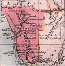 German South West Africa in 1904. De Wet started the Freikorps in Windhoek. Korab, where the German troops surrendered to the Union Defense Force, is also indicated on the map.