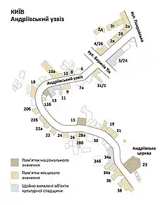 - 1 2 "Andriivskyi uzviz". Kyiv History Site. oldkyiv.org.ua. Archived from the original on 2007-11-09. Retrieved 2009-06-28.
