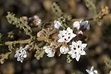 Androcalva crispa, commonly known as crisped leaf commersonia,[2] is a species of flowering plant in the family Malvaceae and is endemic to the south-west of Western Australia. It is a prostrate shrub that forms suckers from rhizomes and has densely new growth, clusters of lobed, egg-shaped or oblong leaves with wavy, serrated edges, and groups of white and pinkish-purple flowers.