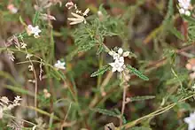 Androcalva pedleyi is a spreading or prostrate shrub that typically grows to 60 cm (24 in) high and 20–150 cm (7.9–59.1 in) wide, its new growth covered with soft, golden hairs. The leaves are linear to lance-shaped, 20–70 mm (0.79–2.76 in) long and 4–40 mm (0.16–1.57 in) wide on a petiole 2–5 mm (0.079–0.197 in) long with linear stipules 2–5 mm (0.079–0.197 in) long at the base. The edges of the leaves have 5 to 16 pairs of lobes 1–4 mm (0.039–0.157 in) long on the edges, the upper surface of the leaves with a few soft hairs and the lower side moderately densely covered with soft, star-shaped hairs. The flowers are arranged in groups of 7 to 10 10–23 mm (0.39–0.91 in) long on a peduncle 4–5 mm (0.16–0.20 in) long. Each flower is on a pedicel 1–3 mm (0.039–0.118 in) long, with bracts 2–9 mm (0.079–0.354 in) long at the base. The flowers are white at first, later pink, 6–7 mm (0.24–0.28 in) in diameter with 5 petal-like sepals, the lobes 3.0–3.5 mm (0.12–0.14 in) long and 2.5–3.2 mm (0.098–0.126 in) wide. The petals are white, 4.0–5.5 mm (0.16–0.22 in) long, and there are 3 staminodes between each pair of stamens. Flowering occurs from August to April.[2][3]