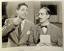 In 1947, at the peak of his popularity, he appeared in the film Copacabana with Groucho Marx and Carmen Miranda.[76] In this film, Russell good-naturedly plays his dumb-bell nightclub singer role with a mild manner, wide-eyes, and a toothy smile. About his performance, co-star, Gloria Jean said, "[He] was very bland, wishy-washy, but he had a lovely voice."[77]