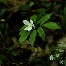 Anemonoides lancifolia (formerly known as Anemone lancifolia), the lanceleaf anemone or mountain thimbleweed, is an herbaceous plant species in the family Ranunculaceae.[1] The genus occurs in the Southeastern United States. Plants grow 20 to 30 cm tall, growing from a horizontally-orientated rhizome, flowering mid-spring to early summer. The flowers have white sepals that are 12–20 mm long. This species much resembles Anemonoides quinquefolia, of which it was formerly considered a subspecies,[1] except that it is larger growing. After flowering, fruits called achenes are formed in a small cluster; each achene is 3.5–5 mm long, lacks wings and has a straight or partly curved beak that is 1–1.5 mm long.