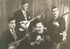 The members of the quartet, and other rebétes (ρεμπέτες; rebetiko musicians) of the period, were the early exponents of the genre referred to as Pireaus rebetiko (Pireotika). The style of music featured a mix of modal and tonal structures performed on tempered instruments (mostly the bouzouki and the baglama, sometimes the guitar), with less ornamented voices and a rough style of singing.[11] Piraeus rebetiko borrowed themes from the underworld (prison life, disdain of the police, use of hashish) which appealed to groups of the lower socio-economic strata and became popular in Greece as recordings became available during the 1930s.[12][3]